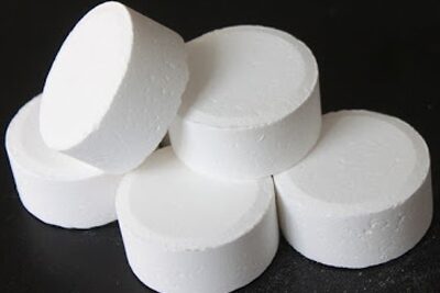Cloramin B dạng các viên nén 250mg. Thông thường, một viên nén Cloramin B 250mg có thể xử lý khử khuẩn cho khoảng 25 lít nước sinh hoạt. Dạng viên nén thì tiện lợi và an toàn với người sử dụng hơn bởi liều lượng hóa chất trong 1 viên nén đã được nhà sản xuất kiểm soát chặt chẽ. Nhưng giá thành cao.