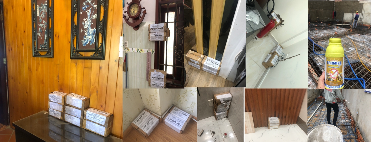 Bước 1: Tại những nơi có Mối xuất hiện đang phá hoại đặt các hộp mồi nhử bên trong là gỗ có chất dẫn dụ để thu hút Mối vào hộp mồi. (thời gian nhử từ 08 – 12 ngày)